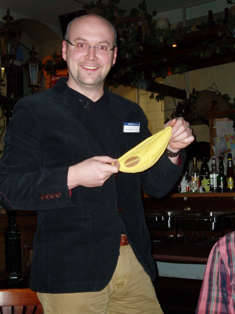 - Bananagrams, eine Art Scrabble ohne Spielbrett, dafür mit Aufbewahrungsbeutel in Bananenform,