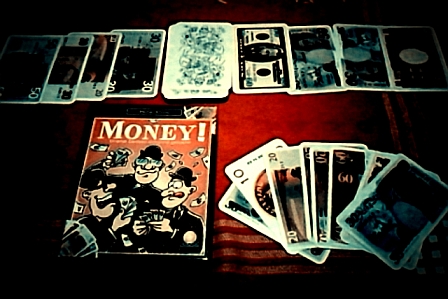 - Dann kam noch einer meiner Flohmarkt-Schnäppchen, auf den ich mich schon sehr gefreut hatte, auf den Tisch: Reiner Knizias Money! – bei dem man mit Geldscheinen aus seiner Hand auf noch mehr Geldscheine in verschiedenen Währungen bietet, um dann für die typische kniziaesk-vertrackte Wertung die meisten jeder Währung gesammelt zu haben – aber man bekommt natürlich noch 200 Punkte abgezogen. Außer man hat über 200 Punkte. Das Spiel hat Ähnlichkeit mit For Sale, gefällt mir aber fast noch etwas besser. Vielleicht liegt das aber nur daran, dass ich gewonnen habe.