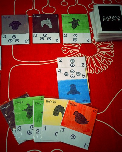 - Es war nun schon soweit, dass an diesem Tisch der dritte und vierte Mann nach Hause mussten, so spielten wir noch eine Zweierrunde von On the Farm, einem Print&Play-Spiel, dass ich vor einiger Zeit auf Boardgamegeek gefunden habe. Es geht darum, Bauernhoftiere zu kaufen und verkaufen und auf diese Weise profitabel zu vermehren, ein wenig so wie bei Jaipur. Einige wollen auch schon Elemente aus dem hochgelobten Ruhm für Rom darin entdeckt haben. Als Vegetarier und jemand der manchmal mit Leuten spielt, die niemals Schwein anfassen würden, habe ich das Spiel aber etwas vegetarisieren müssen; ich habe Kaninchen und Schweine herausgenommen und durch Tiere ersetzt, die man nicht nur für Fleisch hält (Bienen und Ziegen). Dafür habe ich auch gleich für das ganze Spiel neue Karten gemalt.